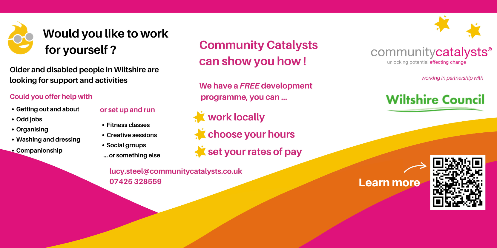 Community Catalysts are working in partnership with Wiltshire Council on a project aimed at helping local people to become self-employed and support older or disabled residents in their own homes or to run activities or groups in the community. Helping local people help other local people.