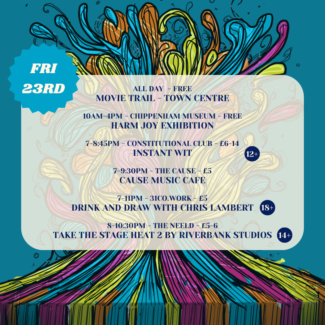 The exciting Chippenham Fringe Feb festival kicks off from Friday 23rd until Sunday 25th February packed with a diverse range of entertaining events for all ages across Chippenham. Highlights include comedy shows, live music performances, an art exhibition, interactive workshops, and family-friendly activities, ensuring there’s something for everyone to enjoy – with affordable entry fees or free!