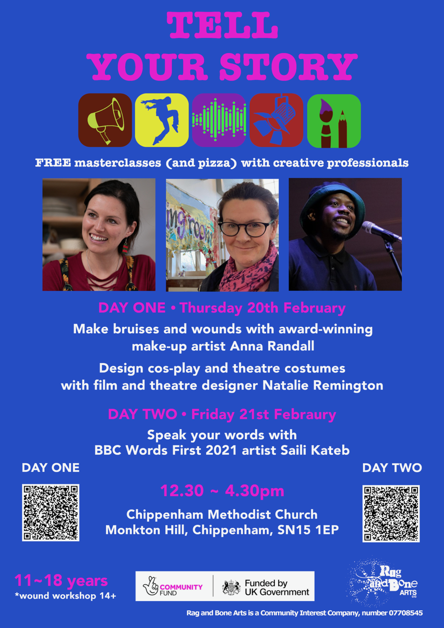 Young creatives aged 11-18 can enjoy FREE workshops in costume design, stage makeup, and spoken word performance, thanks to Rag and Bones Arts CIC and The National Lottery Community Fund. Sessions include: