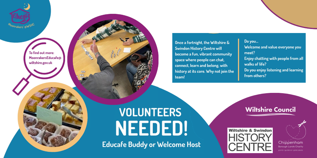 Moonrakers’ Educafe will be held fortnightly from Monday 27th April at the Wiltshire & Swindon History Centre, Chippenham, where we are creating a new welcoming, friendly community space where people can chat, connect, learn and belong, with history at its core. We are looking for volunteers for a range of roles; why not find out more and join the team!