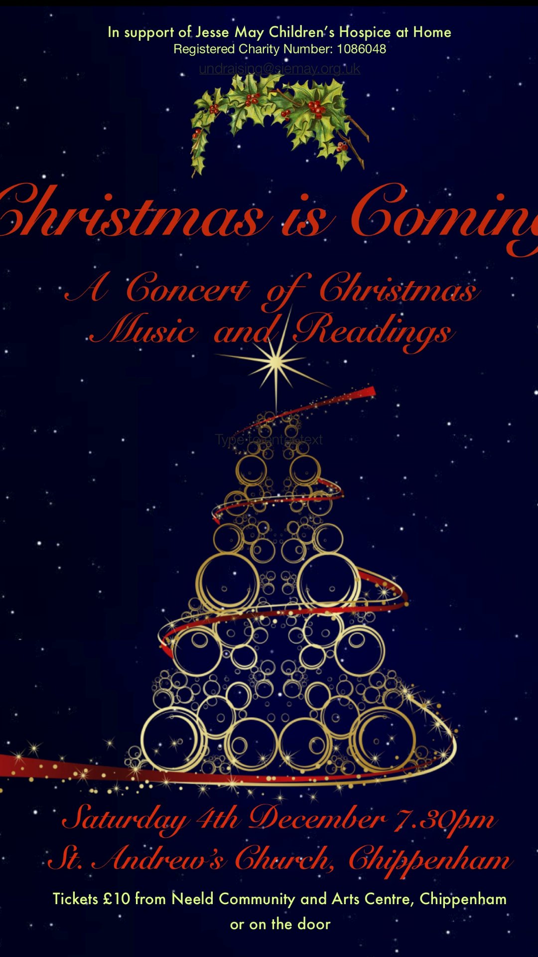 Christmas is Coming – A Concert of Christmas Music and Recordings – 7.30pm – Saturday 4th December at St Andrew’s Church, Chippenham in support of Jesse May Children’s Hospice at Home. Tickets £10 from the Neeld Community and Arts Centre or on the door.
